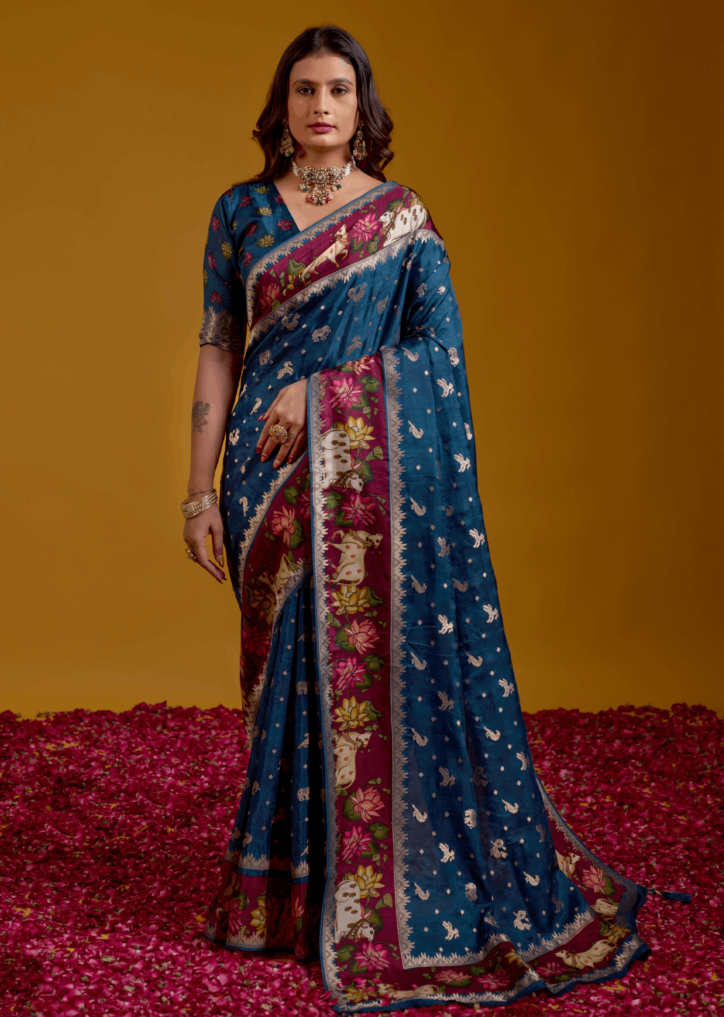 Elevate your festive wardrobe with this exquisite azure viscose saree, designed to captivate with its intricate Pichwai-inspired motifs and elegant floral borders. The vibrant pallu adds a striking touch, making it the perfect festive saree for celebrations where tradition meets modern sophistication. Crafted from lightweight fabric, it ensures effortless comfort and style, ideal for all-day wear. This stunning saree seamlessly blends heritage with contemporary charm, creating a bold and graceful statement. Pair it with striking accessories to enhance its beauty and make a lasting impression at weddings, parties, and cultural events.