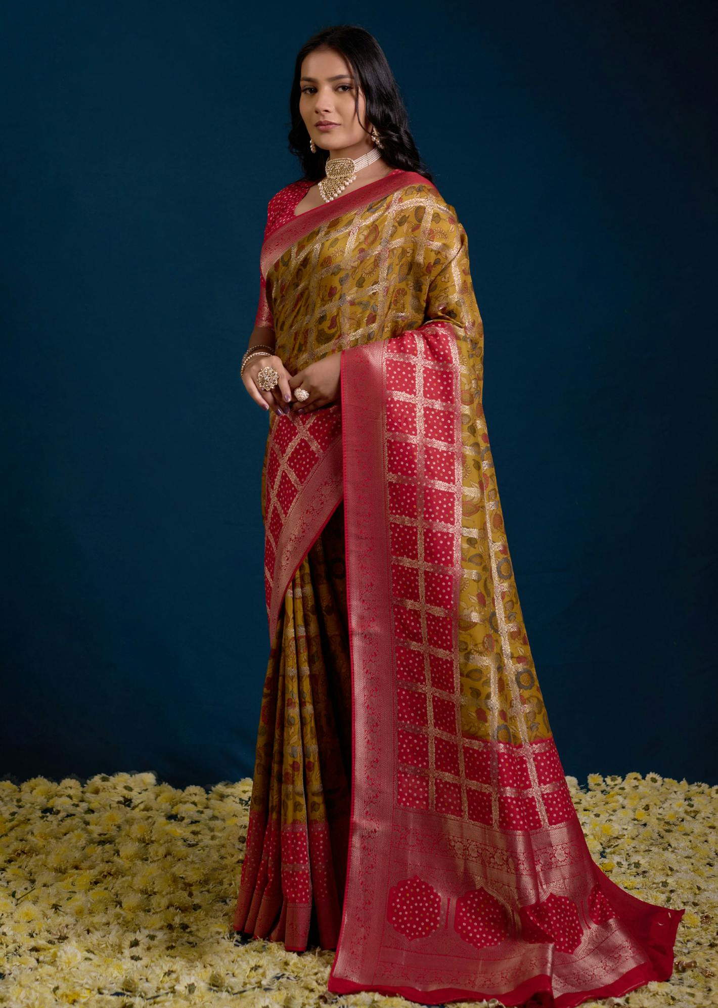This Festive Saree in an elegant gold-toned viscose fabric is adorned with bold red borders and intricate motifs, seamlessly blending tradition with modern style. Its luxurious texture and exquisite craftsmanship make it a perfect choice for weddings, celebrations, and evening galas. Designed for all-day comfort, the lightweight and breathable fabric ensures effortless grace, while the vibrant hues add a touch of festive charm. Ideal for women who appreciate sophistication with a contemporary edge, this saree redefines elegance with every drape, making it a standout piece for any special occasion.