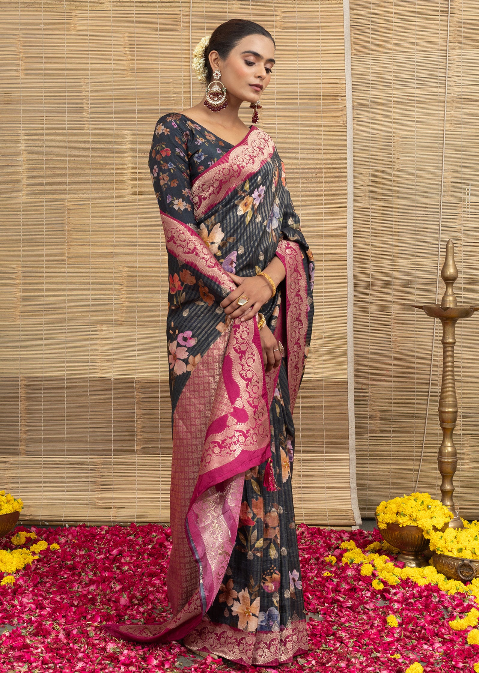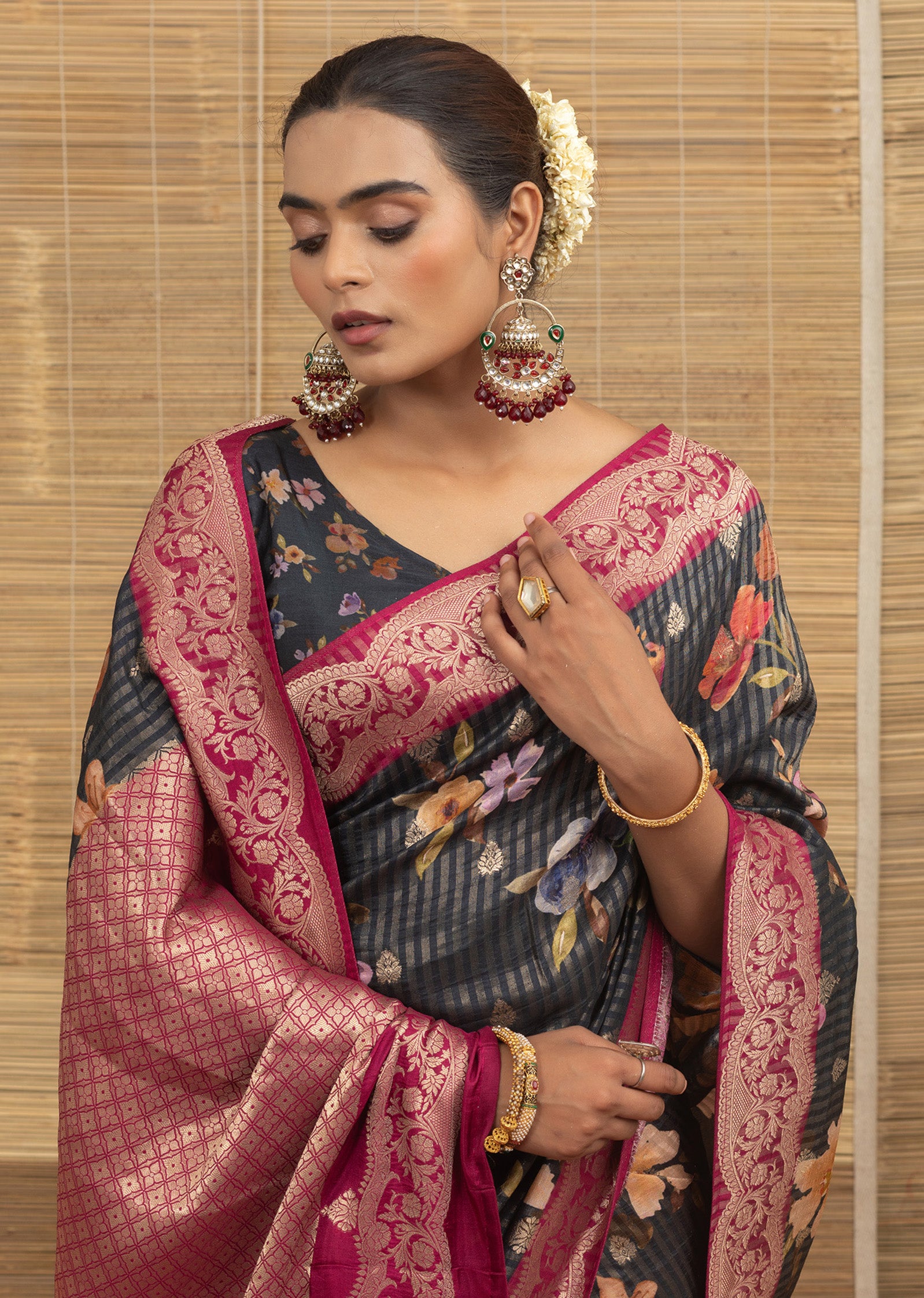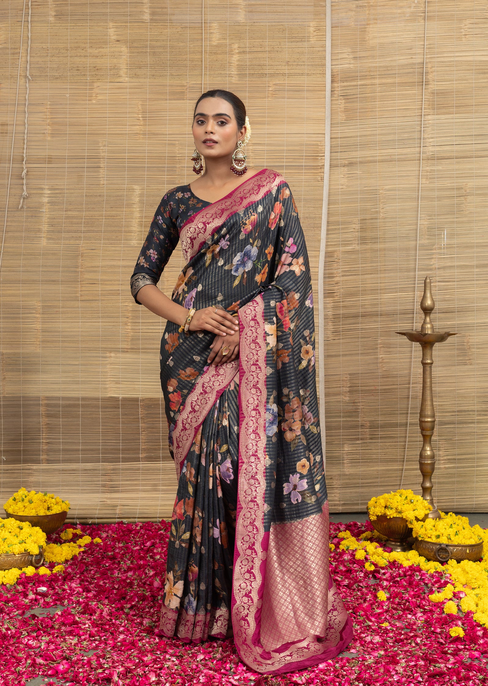 Bold meets beautiful in this pure Dola tissue saree, designed with blooming floral prints and a delicate scalloped border. The soft sheen of tissue adds a hint of glam, while the fluid weave ensures comfort all day. Whether it’s a family gathering or a festive evening, this saree is crafted to turn heads without saying a word.