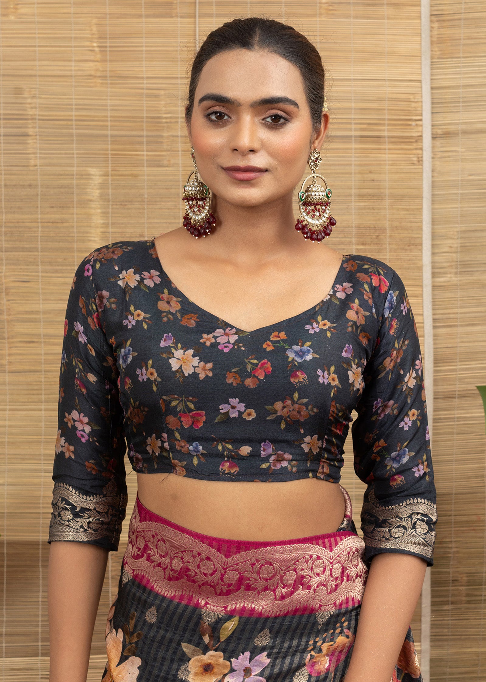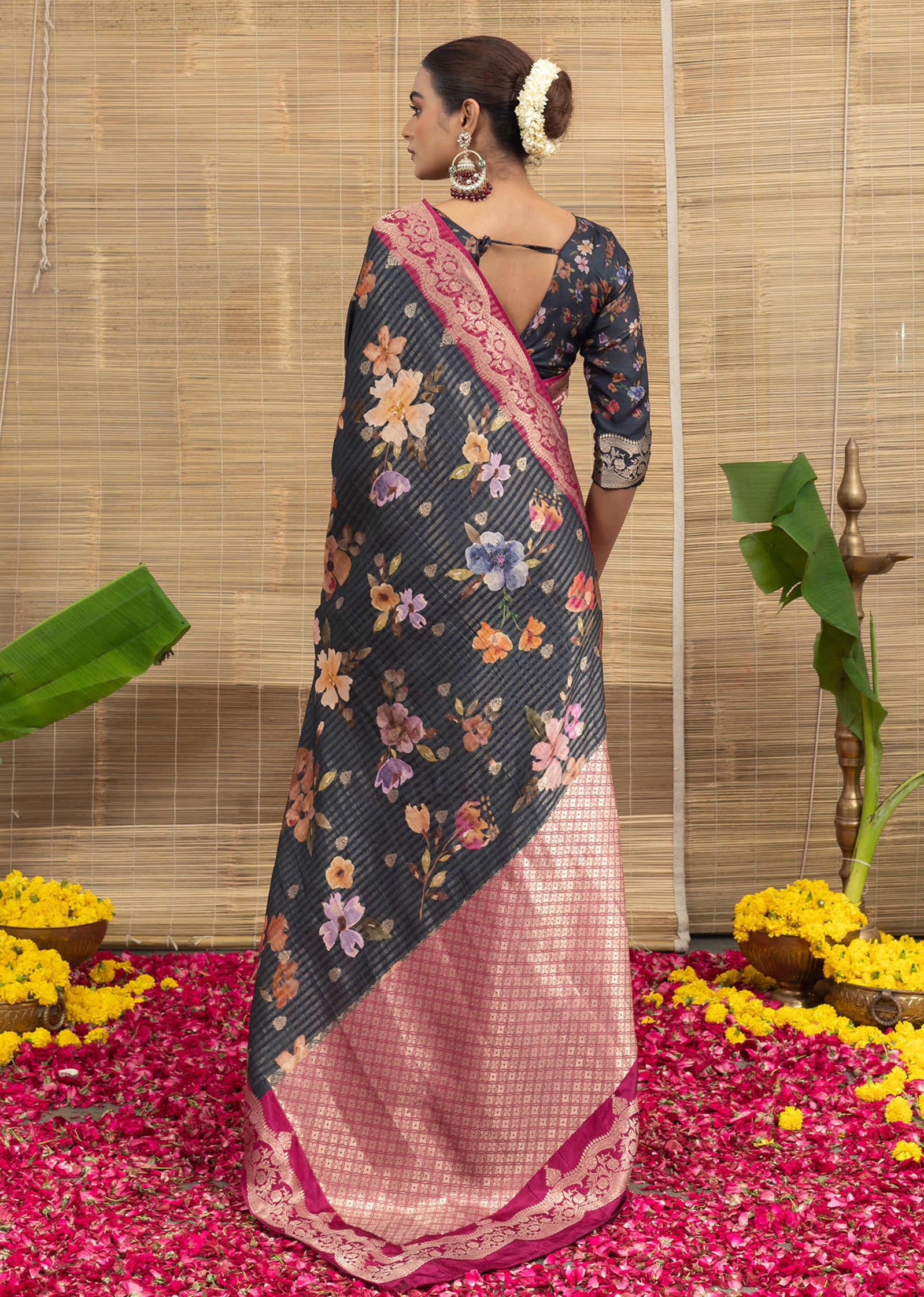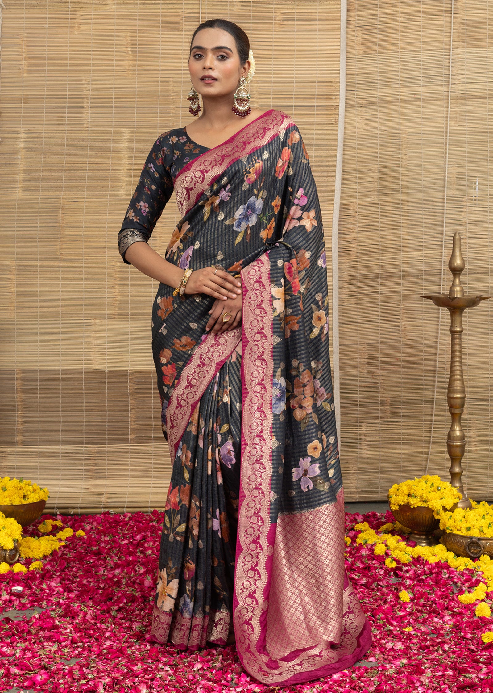 Bold meets beautiful in this pure Dola tissue saree, designed with blooming floral prints and a delicate scalloped border. The soft sheen of tissue adds a hint of glam, while the fluid weave ensures comfort all day. Whether it’s a family gathering or a festive evening, this saree is crafted to turn heads without saying a word.