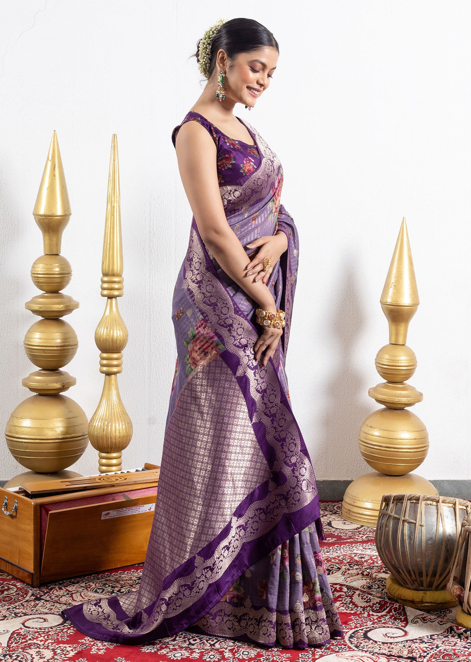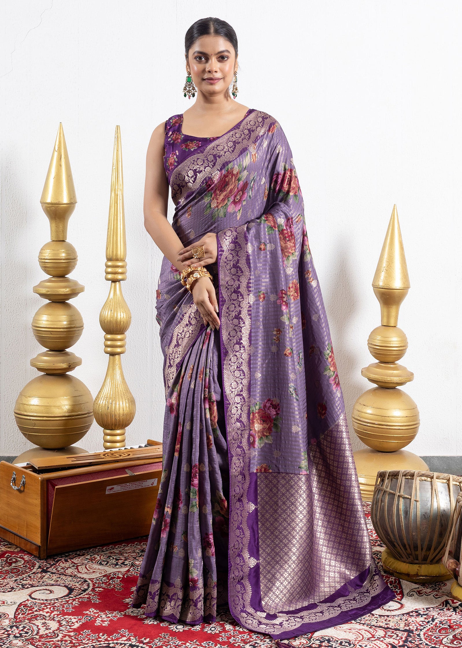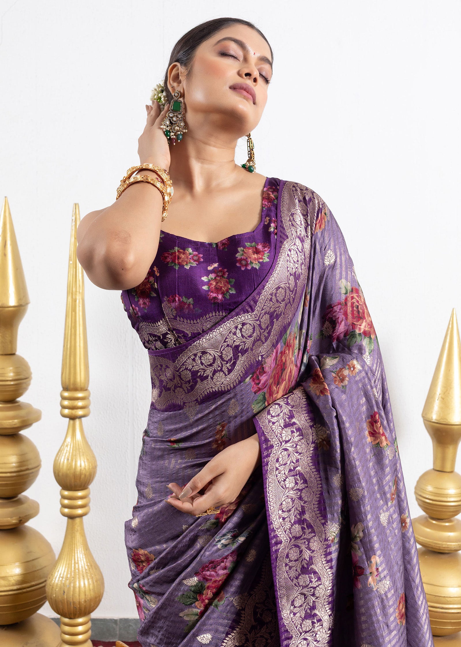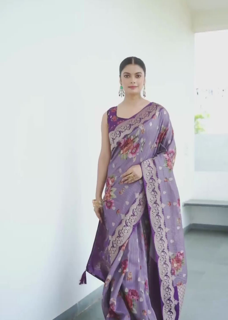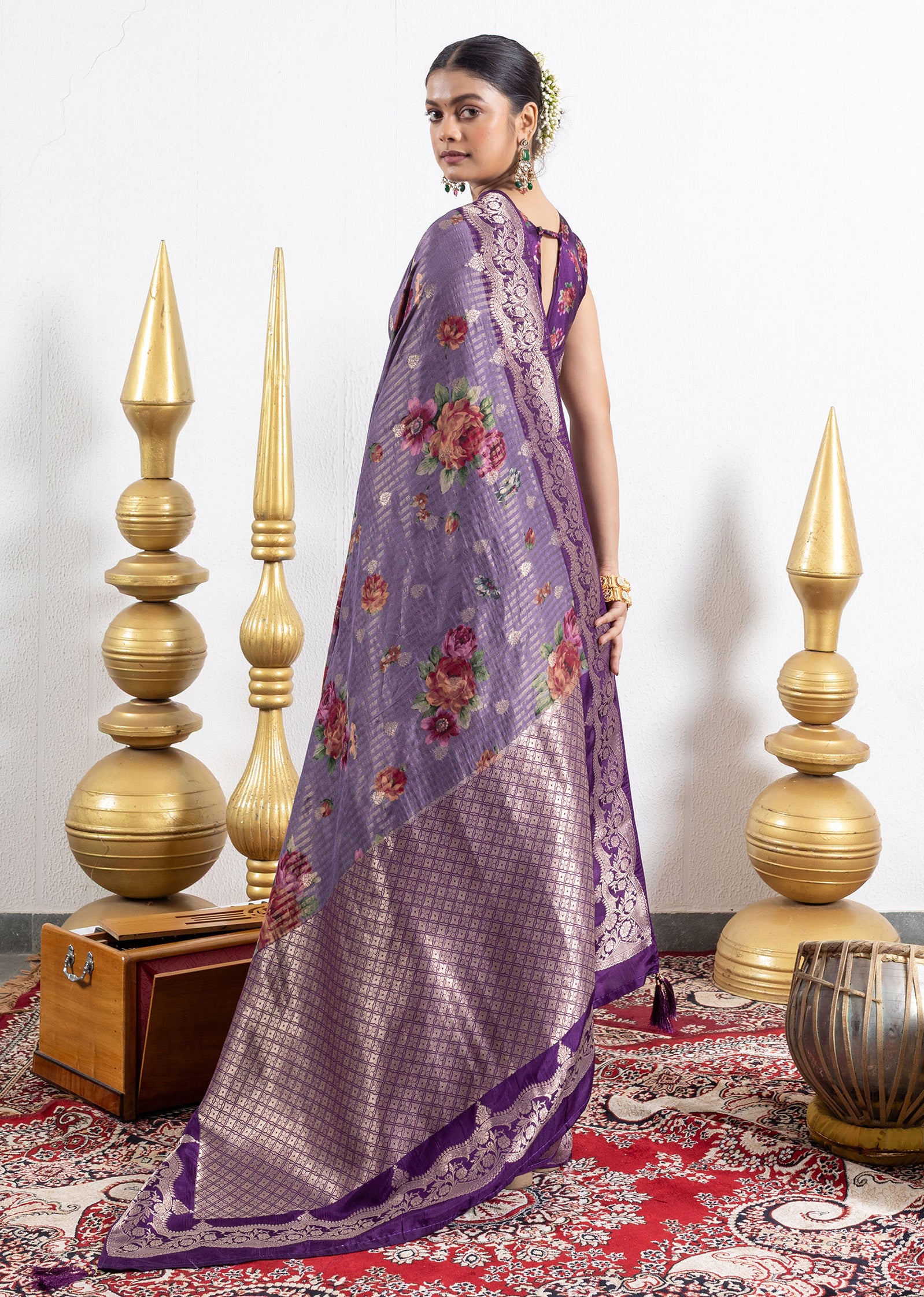 Lavender Zari Weave Border With Flowers Butta Dola Silk Saree
