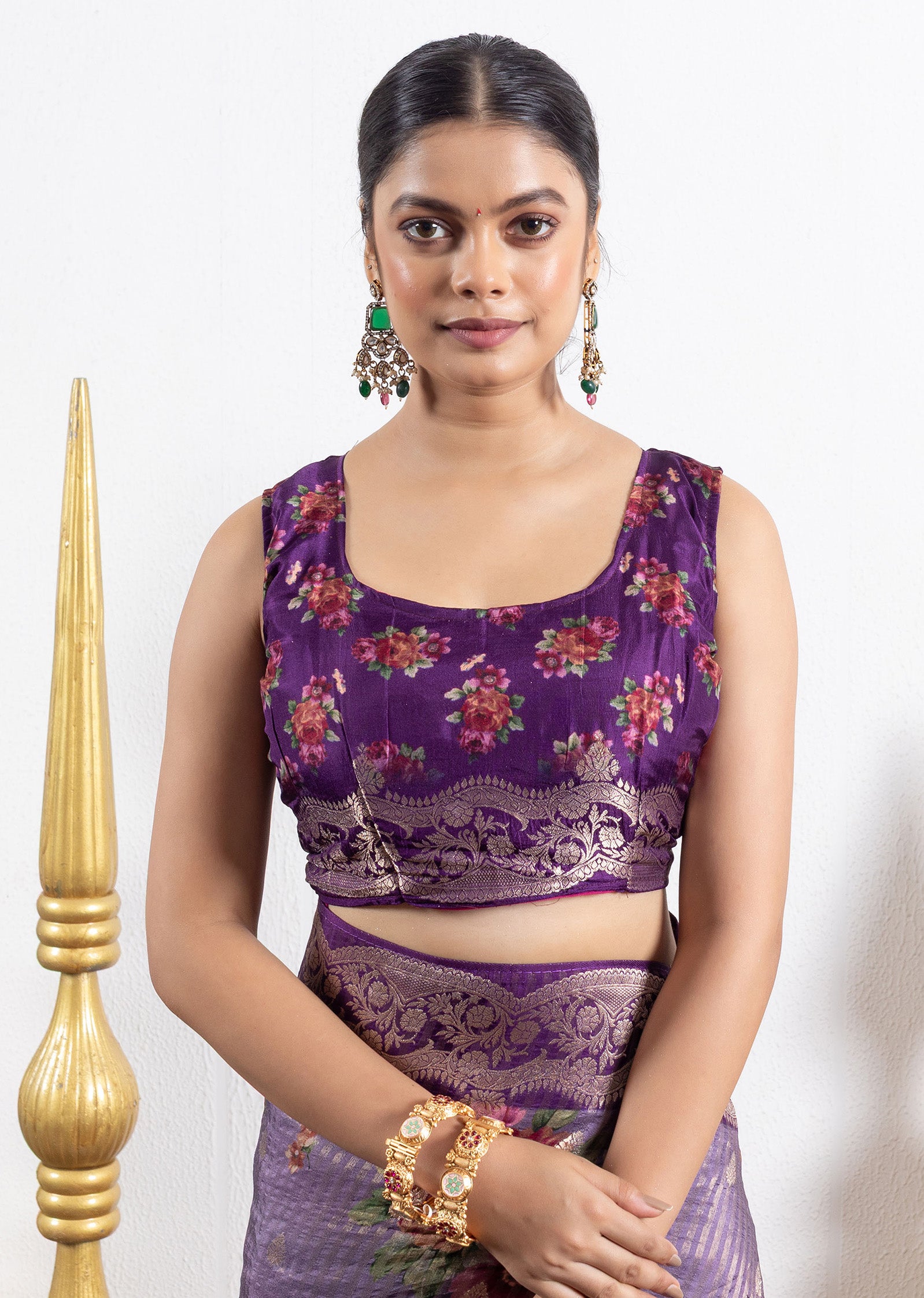This Lavender Zari Weave Border With Flowers Butta Dola Silk Saree has a quiet richness that makes it perfect for special occasions. Crafted in a Dola silk, it features graceful floral prints, a brocade-style zari border, and a scalloped pallu for that elegant finishing touch. Ideal for weddings and evening functions.