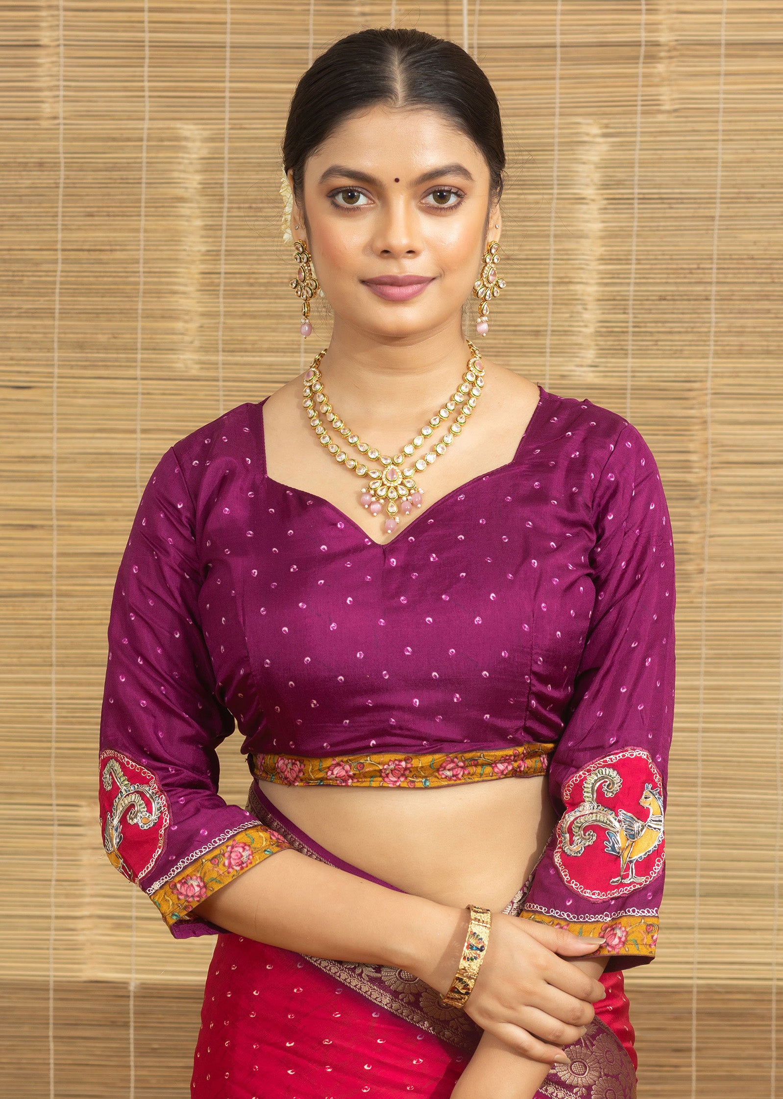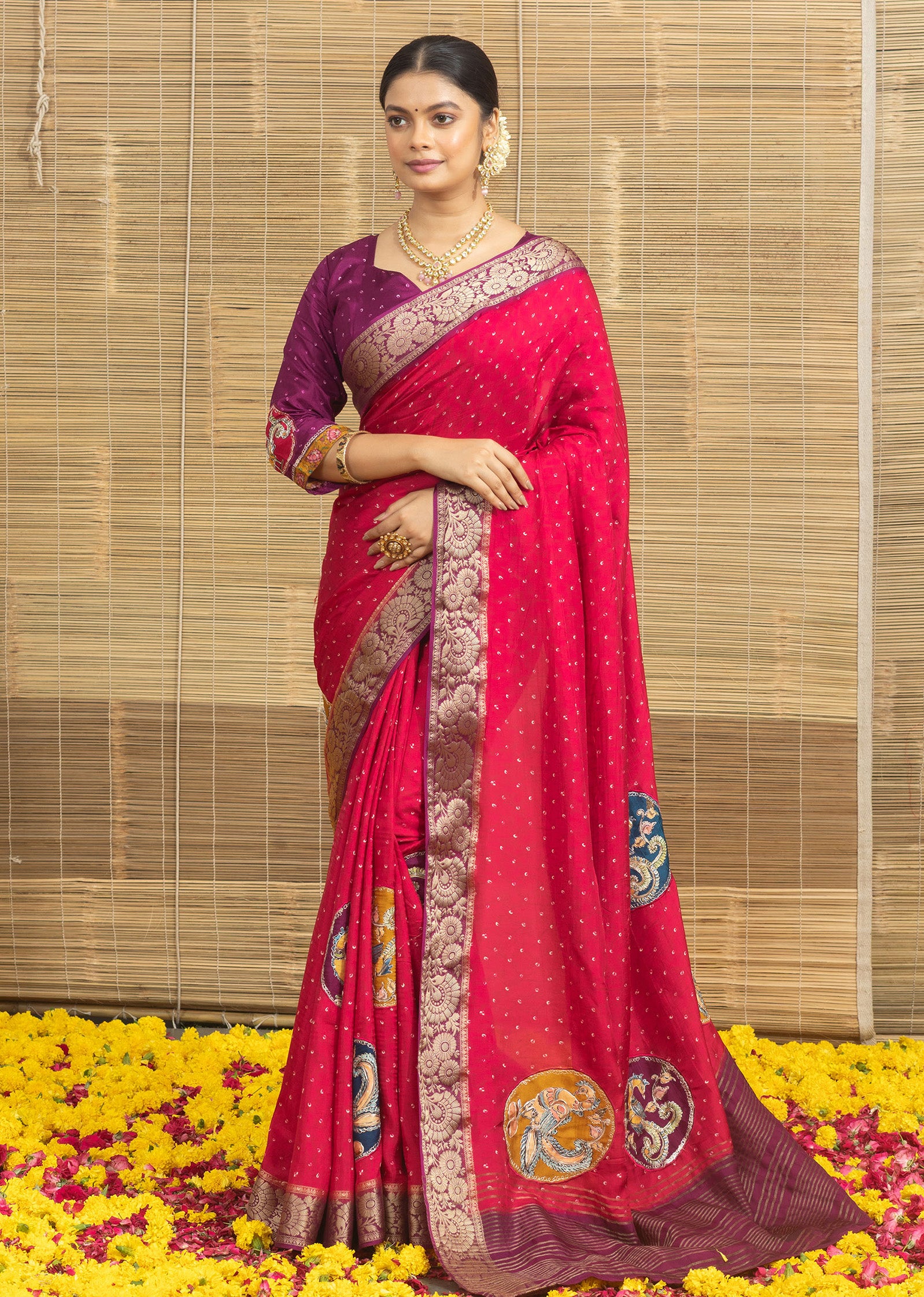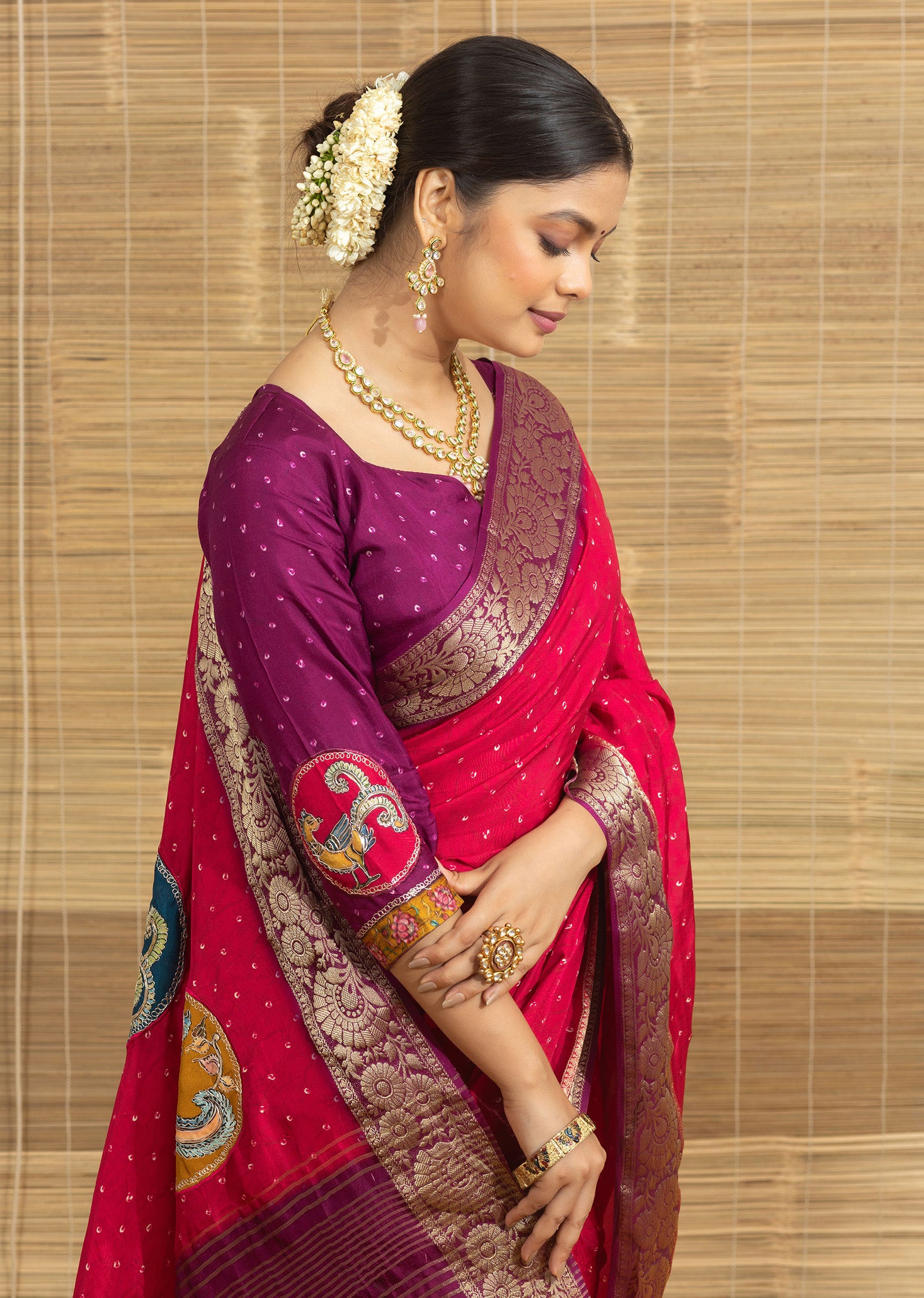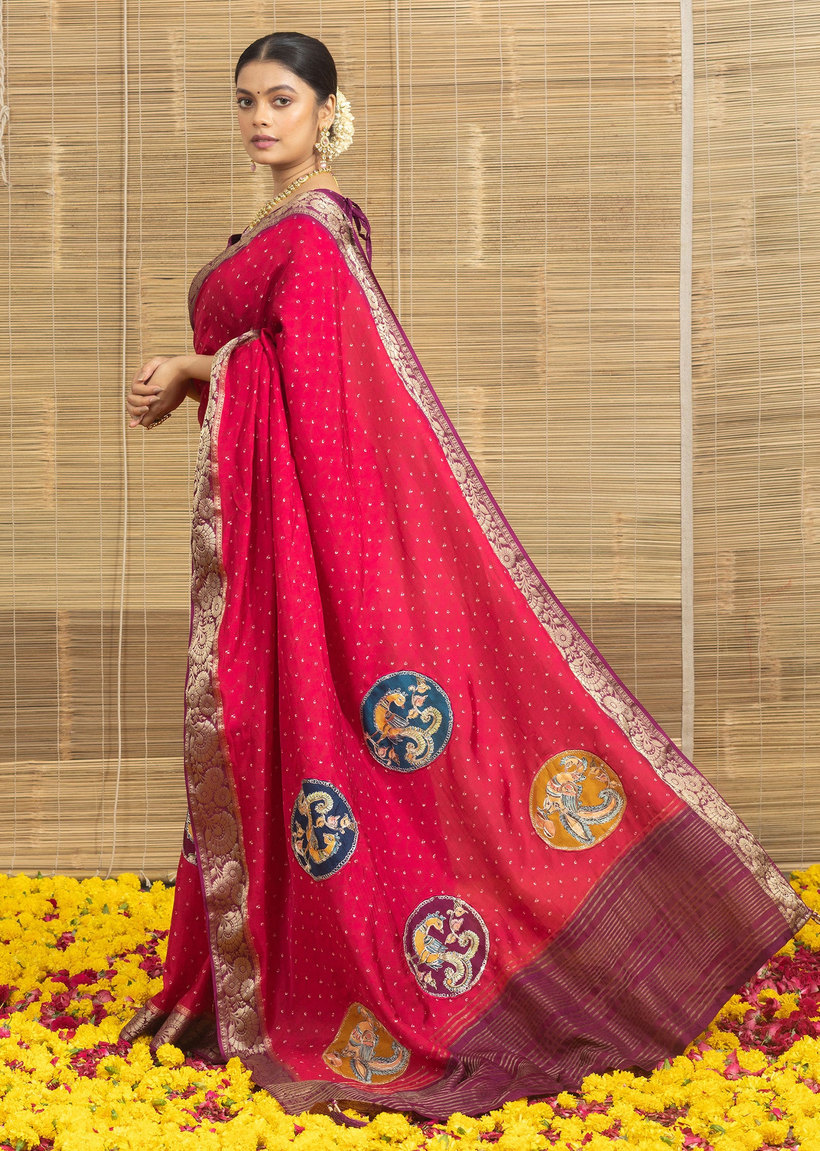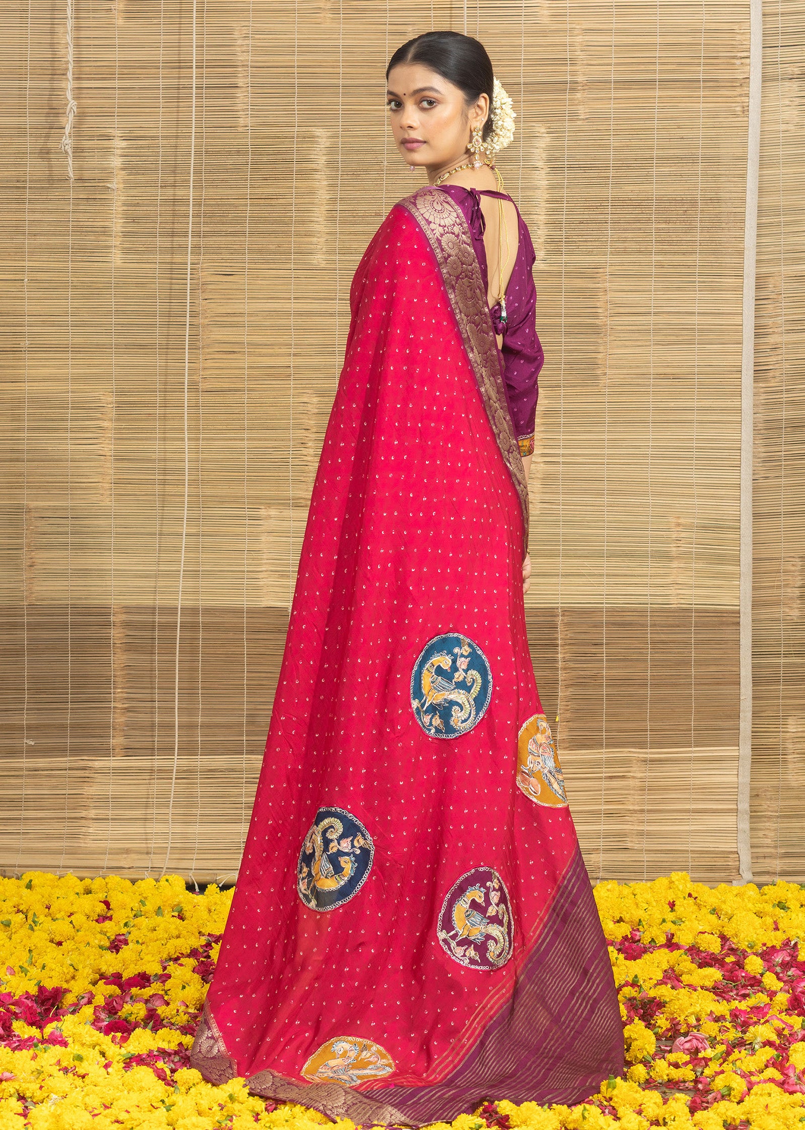 Red Bandhani Print With Elephant Butta Dola Silk Saree